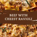 Beef with Cheesy Ravioli is a hearty, comforting dish featuring rich ground beef tomato sauce, cheese-filled ravioli, and a golden melted cheese topping—an easy, crowd-pleasing dinner full of flavour.