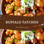 Buffalo Tatchos are loaded tater tot nachos topped with spicy Buffalo chicken, melted cheese, and creamy dressings. A fun, indulgent twist on classic comfort food, perfect for game day or parties.