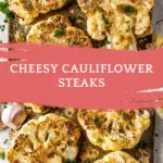 Thick roasted cauliflower steaks with golden edges, topped with melted cheese for a rich, flavorful, and satisfying vegetarian dish.