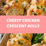 Cheesy Chicken Crescent Rolls are flaky, golden-brown pastries filled with creamy shredded chicken and melty cheddar cheese. Made with store-bought crescent roll dough, this easy recipe is perfect for a comforting appetizer, quick dinner, or kid-friendly snack.