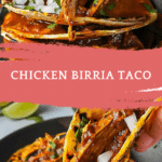 Flavorful chicken birria tacos made with tender shredded chicken simmered in a rich chile broth, then crisped in dipped tortillas. Served with a savory consommé for dipping, they are bold, juicy, and satisfying.