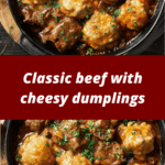 Classic Beef with Cheesy Dumplings is the perfect cozy meal for any night of the week. The rich, savory beef stew pairs beautifully with the soft, cheesy dumplings that soak up all that hearty gravy. It’s simple, comforting, and guaranteed to become a family favorite. Whether made for a Sunday dinner or a special occasion, this dish brings warmth and satisfaction to every bite.