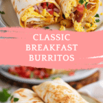 Classic breakfast burritos are a hearty and customizable morning meal featuring scrambled eggs, crispy bacon or sausage, golden potatoes, cheese, and salsa all wrapped in a warm flour tortilla. Perfect for meal prep and on-the-go breakfasts.