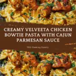 Creamy Velveeta Chicken Bowtie Pasta with Cajun Parmesan Sauce is a rich and indulgent pasta dish featuring Cajun-spiced chicken, bowtie pasta, and a velvety cheese sauce made with Velveeta and parmesan. It’s creamy, bold, and perfect for a comforting meal.