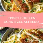 Crispy Chicken Schnitzel Alfredo is a comforting dish that pairs golden breaded chicken with creamy Parmesan Alfredo pasta. The crunchy schnitzel contrasts perfectly with the rich, smooth sauce for a hearty and satisfying meal.