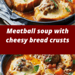 A hearty, comforting meatball soup simmered with vegetables and rich broth, served with crispy, golden cheesy bread crusts that add crunch, gooey cheese, and extra indulgence to every spoonful.