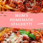 Mom’s Homemade Spaghetti is a comforting classic featuring a rich, meaty tomato sauce simmered with garlic, herbs, and pantry staples. Served over spaghetti and topped with Parmesan, it’s a beloved family favorite perfect for weeknights or Sunday dinners.