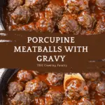 Porcupine Meatballs with Gravy are tender ground beef meatballs mixed with uncooked rice and simmered in rich brown gravy. The rice expands while cooking, creating a ‘porcupine’ appearance. It’s a nostalgic, hearty dish perfect for family dinners.