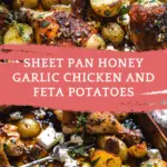 This sheet pan honey garlic chicken and feta potatoes is a flavorful all-in-one meal with juicy glazed chicken, crispy roasted potatoes, and tangy feta cheese. It is an easy weeknight dinner packed with sweet, savory, and zesty flavor.